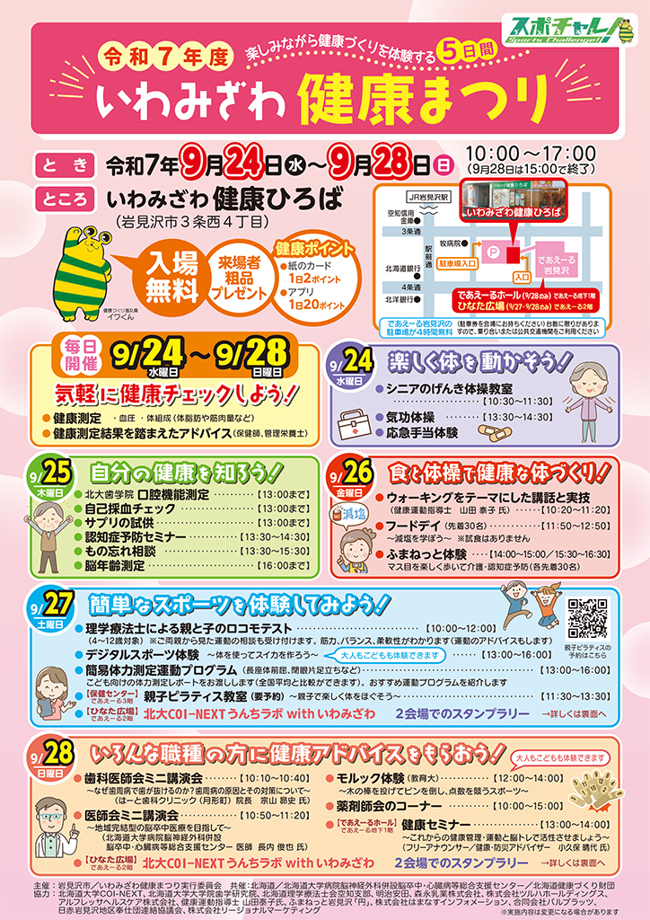 2025年9月27日に開催された「岩見沢市健康まつり」にて、私たちの取組をご紹介いたしました。 当日説明を担当いたしました研究室メンバーは以下の通りです。 教授 相沢智康 学生 阿部潤(MC2)、赤坂美穂(MC1)